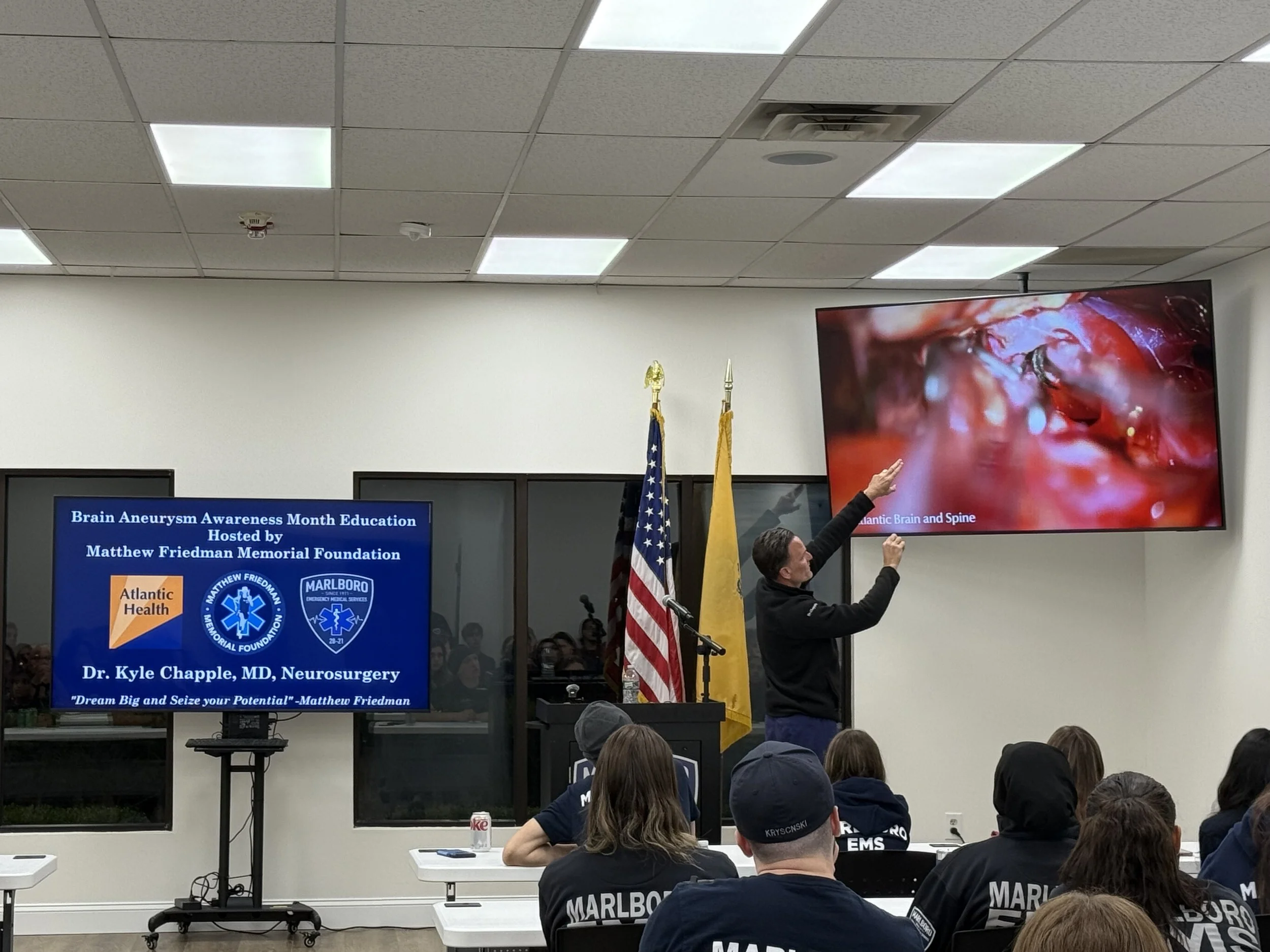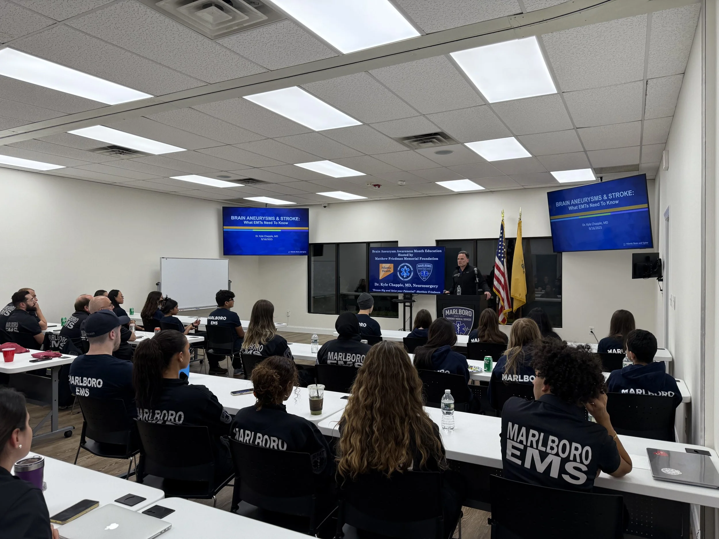 On Tuesday, September 16, 2025, the Matthew Friedman Memorial Foundation hosted Dr. Kyle Chapple, MD at Marlboro EMS for an educational session on Brain Aneurysms. More than 50 volunteer EMTs participated in this program, where Dr. Chapple delivered an in-depth review of brain aneurysm recognition, treatment considerations, and patient management. The education emphasized: